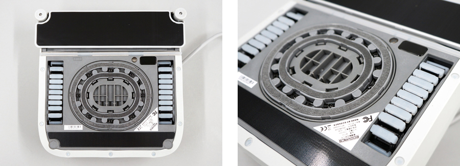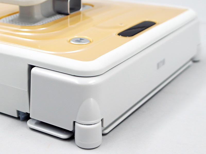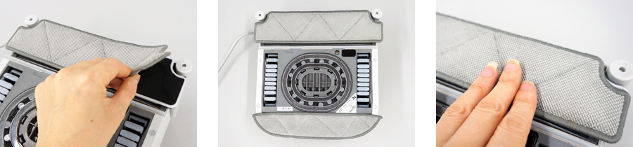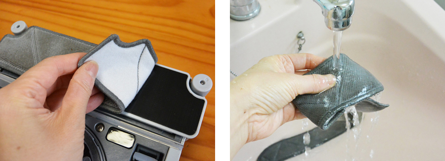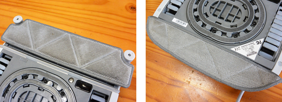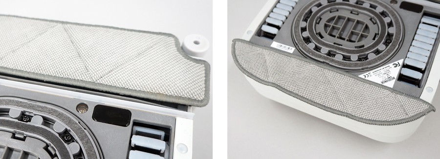 底面の前後にある黒い部分に、付属のパッドを装着。面ファスナー(マジックテープのようなもの)のように、くっつく仕様なので手間ではありません。パッドは毛羽立っていませんが、細かい凹凸があり、汚れがよく落ちそうです