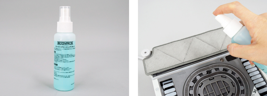 清掃ステップの1番目、“洗浄液付きのパッドで汚れを浮かせ取る”ために、同梱の洗浄液を前方のパッドにのみ噴射します