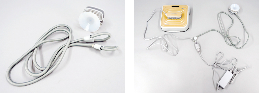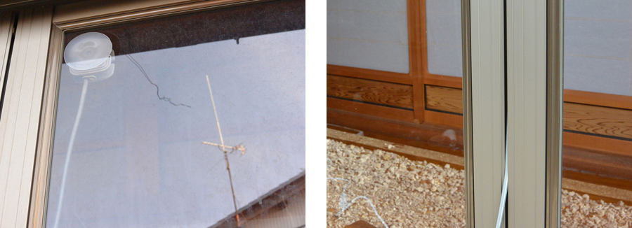 安全対策のまず1つめは、命綱のように本体をロープでフォローするというもの。本体とつながっている電源コードにロープを取り付け、もう片方のロープの先端を吸盤で窓の上に固定します