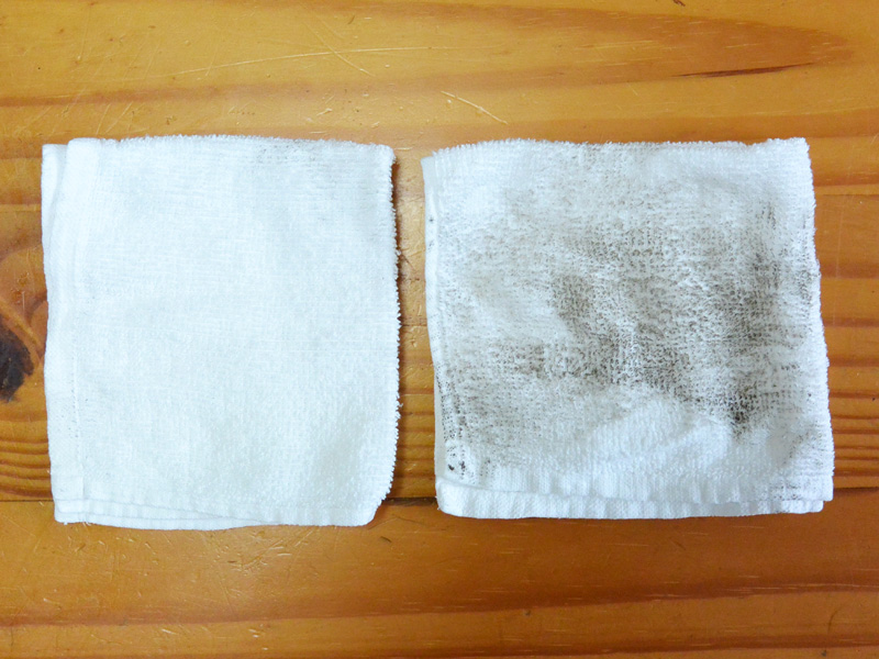 1回の掃除でどのぐらい拭き残しがあるのかを確かめてみました。左が、「WINBOT W710」で掃除した後に窓全体を拭いた雑巾。ほとんど、汚れていません。右は、今回掃除した窓の隣にある窓を拭いた雑巾です。これだけの汚れを、「WINBOT W710」が拭き取ってくれたということになりますね