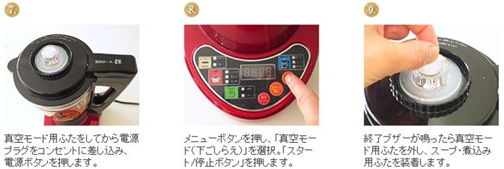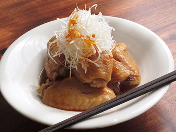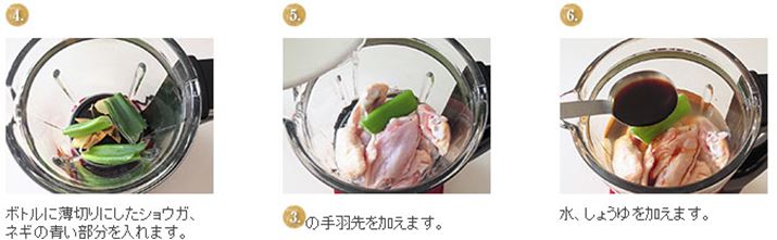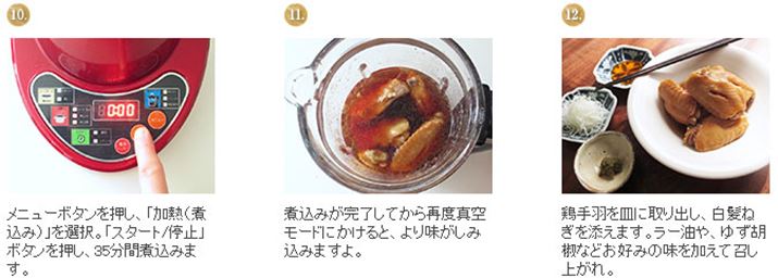 今回は、エスキュービズム・エレクトリックの真空ミキサー「らくっく WM-001」を使って、鶏手羽のやわらか煮を作ります。ボトル内で鶏手羽を調味液につけ、真空状態にすれば味をぐっとしみ込ませることができるので、薄味でも満足の仕上がり。加熱機能を使ってゆっくり煮込んだら、最後にもう一度真空機能を使うと、より味なじみがよいようでした。余った煮汁でゆで卵を煮てもおいしいですよ。