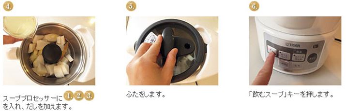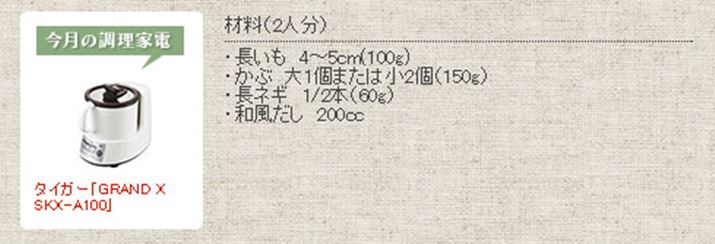 今回は、胃にやさしい長いもやかぶ、体を温めると言われる長ネギを使って、白いポタージュを作りましょう。1台でスープメーカーとフードプロセッサーの役割をしてくれるタイガー「IHスーププロセッサー SKX-A100」なら、下ごしらえがとても簡単です。和風だしでしみじみとした味わいに仕上げるので、写真のように、細めのうどんにかけて塩揉みしたカブの葉をのせてもおいしいですよ。年末年始のごちそうで疲れた胃をいたわってくださいね。