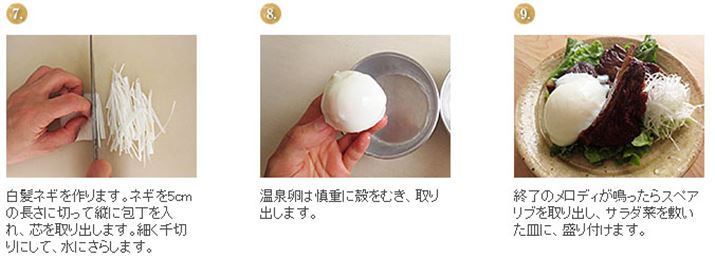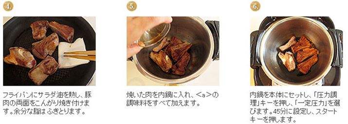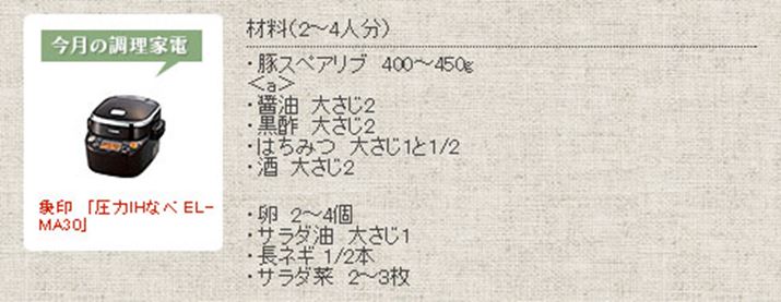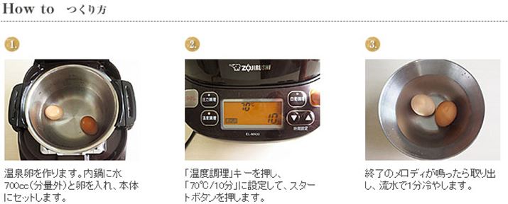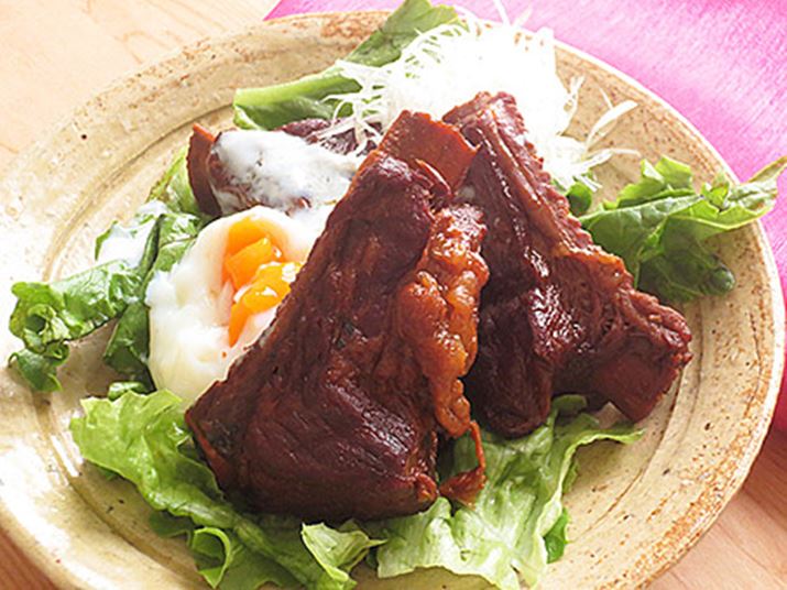 今回は象印「圧力IHなべ EL-MA30」を使って、スペアリブの黒酢煮と温泉卵を作ります。圧力をかけるだけではなく、温度帯を細かく設定できる調理器なので、温泉卵を作るのも簡単。6個まで作れますから、まとめて作ってもよいですね。スペアリブは、黒酢が入るのでさっぱりとしたコクが加わり、よりやわらかに。味のしみた豚肉に、とろりとした卵をソースのようにからめて、しゃきしゃき白髪ネギと一緒に召し上がれ。