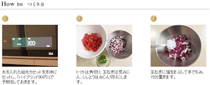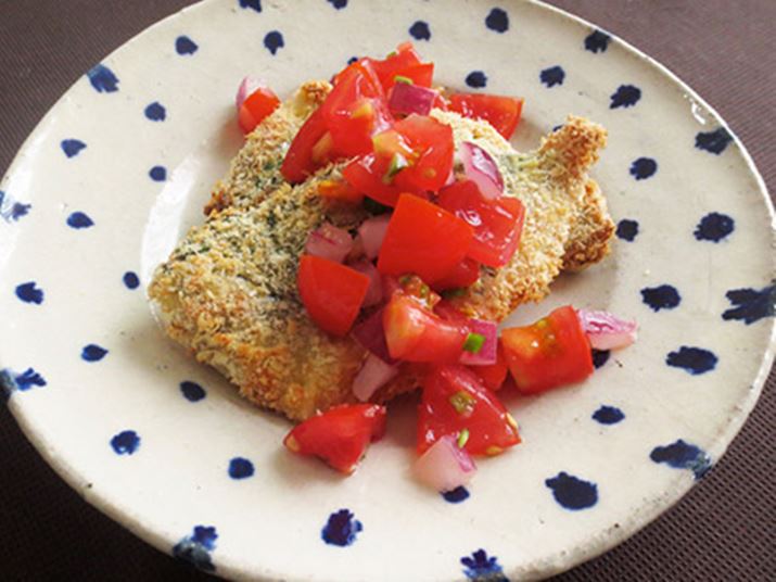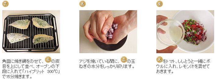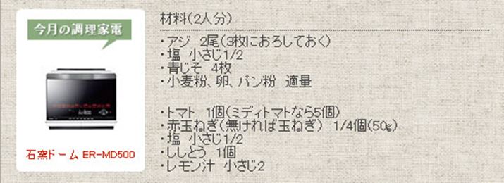 今回は過熱水蒸気オーブンレンジ 「石窯ドーム ER-MD500」を使って、青じそアジフライを作ります。オーブン加熱と過熱水蒸気を組み合わせた「ハイブリッド」調理機能を使うことで、まったくオイルを使わなくても、カラッと焼き上がりますよ。上にかけるトマトのソースもノンオイルなので、普通のアジフライよりも、大幅にカロリーオフできます。おいしく食べて、残暑をさわやかに乗り切って下さいね。