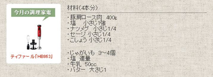 今回は「ティファール インフィニーフォース HB863」を使って、つなぎを入れない、豚肉100%の粗びきソーセージを作ります。チョッパーのアタッチメントを使えば、お肉のひき加減も自由自在。新鮮なおいしい豚肉を自分で選べるのもうれしいですね。ソーセージと相性ぴったりのマッシュポテトも、このブレンダーを使えばあっという間。鍋の中で混ぜることができるので、後片付けも楽々です。ソーセージが余ったら、ぜひのり巻きを作ってみてください。意外なおいしさですよ。
