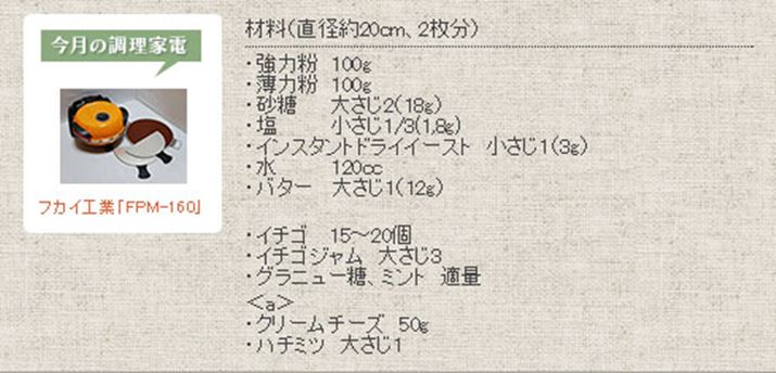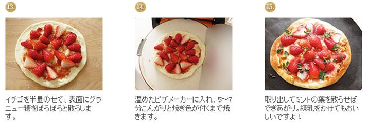 ようやく春らしくなってきました。今回は、フカイ工業「さくさく石窯 ピザメーカー FPM-160」で、イチゴのデザートピッツァを作ります。このピザメーカーは410℃まで温度が上がり、短時間で本格的なピッツァが焼きあがりますよ。ビニール袋を使って、ピザ生地を手軽に作る方法をご紹介しますので、ぜひ挑戦してみてくださいね。とろりと甘く、香り高いイチゴのピッツァ、春の女の子パーティにもどうぞ!