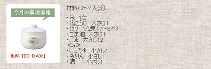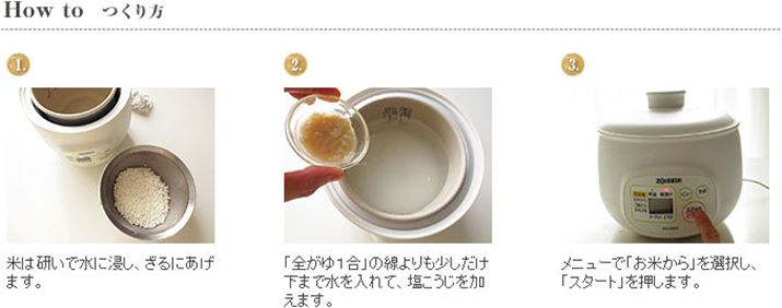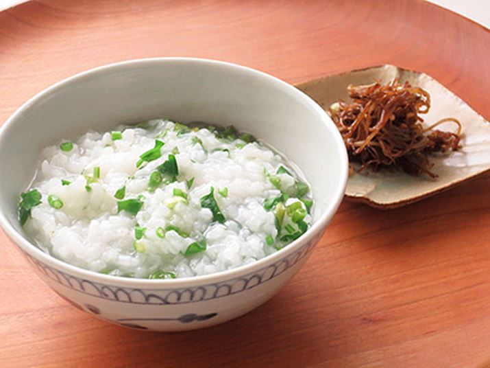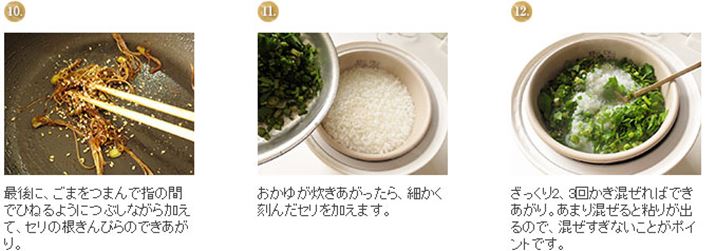 今回は、象印「おかゆメーカー EG-DA02」を使って、香り高いセリのおかゆを作ります。おかゆには塩こうじを入れることで甘みとコクが加わります。また、春の七草の1つであるセリには、血液の流れをよくしたり、利尿を促したり、胃の働きをよくしたりする効能があると言われています。セリの根はきんぴらにするとおいしくいただけますよ。年末からお正月のごちそうに疲れた胃を、おかゆでやさしくいたわってくださいね。