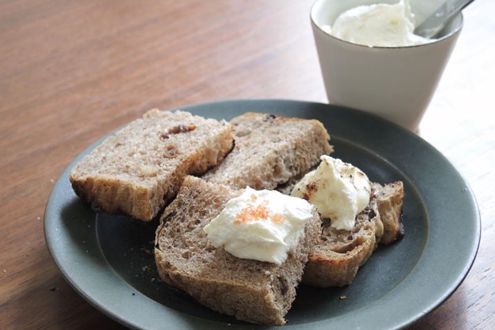 今回はホームベーカリー「siroca SHB-712」を使って、フレッシュチーズを作ります。それから、そのチーズによく合う全粒粉とライ麦のパンを焼きましょう。くるみやドライフルーツを加え、香ばしく秋らしいパンになりました。ライ麦粉が手に入らない場合は同量の全粒粉で作ってください。できたてのチーズをカリッと焼いたパンに乗せてお気に入りの塩やはちみつ、インスタントコーヒーなどをかければ、ワインにもコーヒーにもよく合う一品になりますよ。