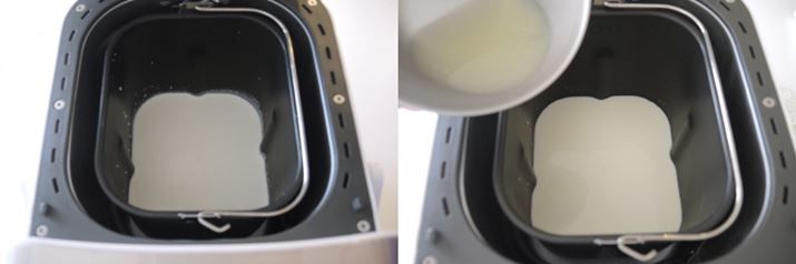(7)パンケースに羽根をセット。水からインスタントドライイーストまでの材料をすべて入れ、「メニュー7」を選んで「スタート」を押します。