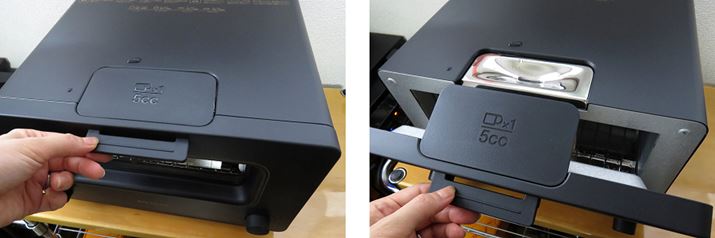 給水口は本体上部に。前面の扉を開くと給水口のフタが一緒に開く仕組みになっています。これなら、ゴミが入らないしフタを無くさなくて済むので◎