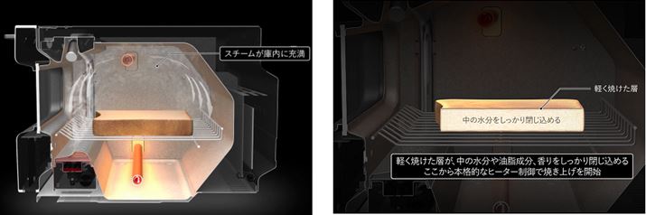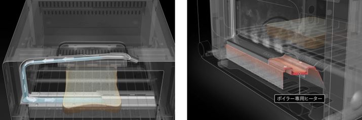 まずは、「BALMUDA The Toaster」が一般的な数千円のトースターと何が違うのか、その組みを紹介しましょう。最大の特徴は、同社独自の「スチームテクノロジー」とコンピューターによる「完璧な温度制御」による自動トースト機能です。