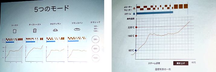 自動制御のトーストモードは、パンの種類のあわせて「トースト」「チーズトースト」「フランスパン」「クロワッサン」の4つのモードを搭載。重要な3つの温度帯とそれぞれに最適な焼き時間がプログラミングされており、ヒーターが頻繁にオン・オフを繰り返し温度制御をしていることがわかります(資料は発表会時のもの)。これにより“究極のトースト”が焼けるのだそう(トーストの様子は次ページでご確認ください)