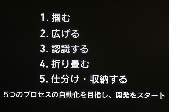 「つかむ」「広げる」「認識する」「折りたたむ」「仕分け・収納する」のプロセスを自動化することを目指し、開発を続けている