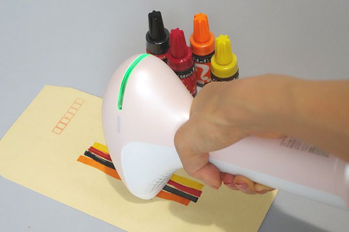 油性ペンで書いた線の一部を SC2008で3回照射。さらに濡れタオルで拭いたところ、照射した部分の黒インクのみ反応し消えています。オレンジ、黄、赤のインクにはまったくダメージがありません
