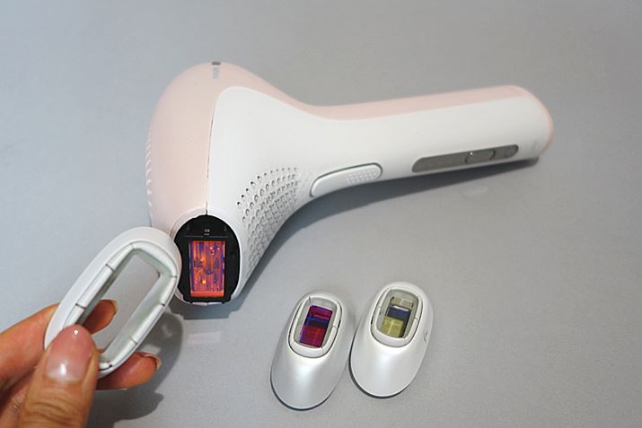 光を照射する特殊ランプは、約14万回使用できるそう。照射口のアタッチメントは外せるので掃除も簡単。「顔用」「ビキニエリア用」のアタッチメントが付属します