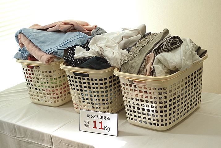 一度に洗濯できる量=11kgのイメージ(標準的な脱衣かご3個分に相当するという)。ドラム径が大きくなったことで、衣類の投入口もサイズアップ。毛布のような大きな洗濯物の出し入れもスムーズに行える