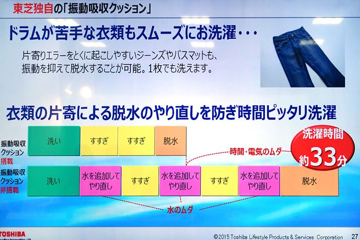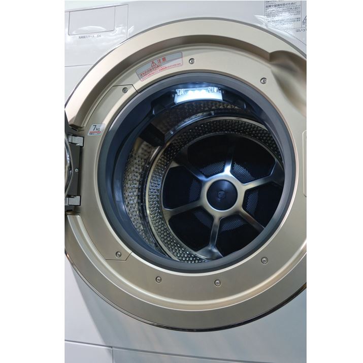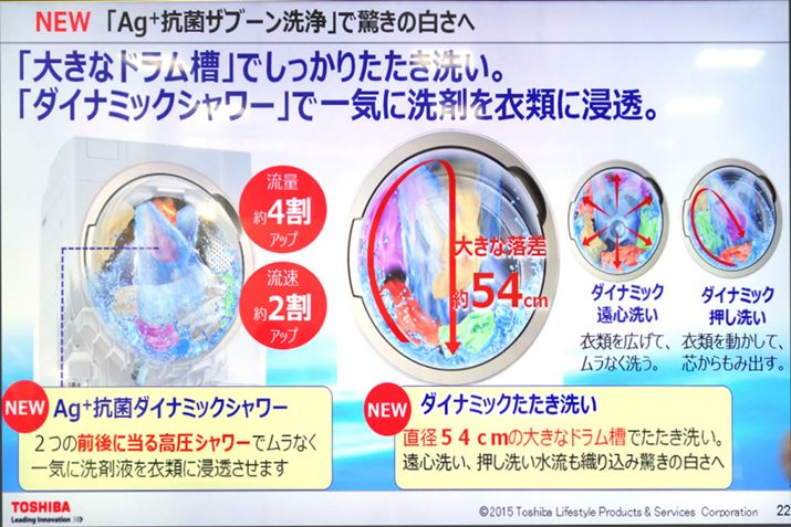 ドラム径が大きくなったことで、洗浄力もアップした。ドラム式洗濯機は、洗濯物を遠心力で持ち上げて、下方向に落とすという「たたき洗い」が特徴の1つ。TW-117X3は、ドラム径が大きくなったことで「たたき落す」ための高低落差が大きくなり、より強い力で汚れを落とせるようになった。また、放出される水をの流量は、従来機よりも約40%アップ。ドラムの前後から高圧のシャワーで洗剤液を衣類に浸透させるため、洗浄力はさらにアップしたという。