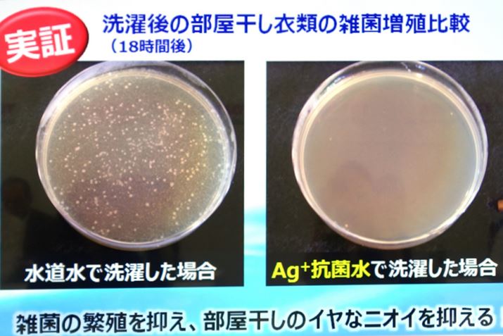 水道水で洗濯した衣類と、Ag+抗菌水で洗濯した衣類の菌を18時間培養した実験結果。Ag+抗菌水側は、菌の繁殖がほとんどみられなかった