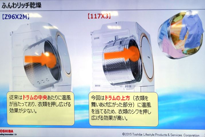 従来はドラム中央に向けられていた温風を、TW-117X3はドラム上部に向けて吹き付ける。衣類が一番広がっているタイミングで強い風をあてることでシワを伸ばす効果がある
