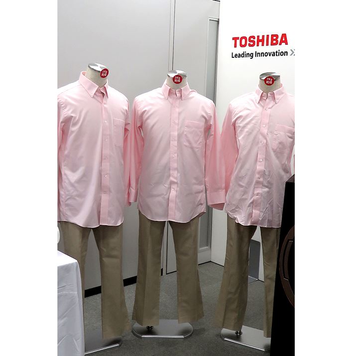 会場には、TW-117X3で乾燥させた綿素材のYシャツとパンツも展示されていた。左から1kg、3kg、7kgの衣類と同時に乾燥したもの