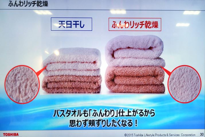 衣類をふっくら乾燥させる「ふんわリッチ」乾燥により、タオルなどは天日干しをするよりも柔らかくふっくらと仕上がるという