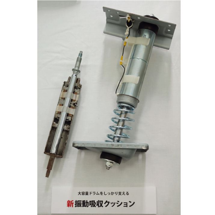「新 振動吸収クッション」。振動を受け止めて、横揺れを抑える「高減衰ゴム」と、電流のON/OFFで固さが変わる「MR流体」によって構成されている