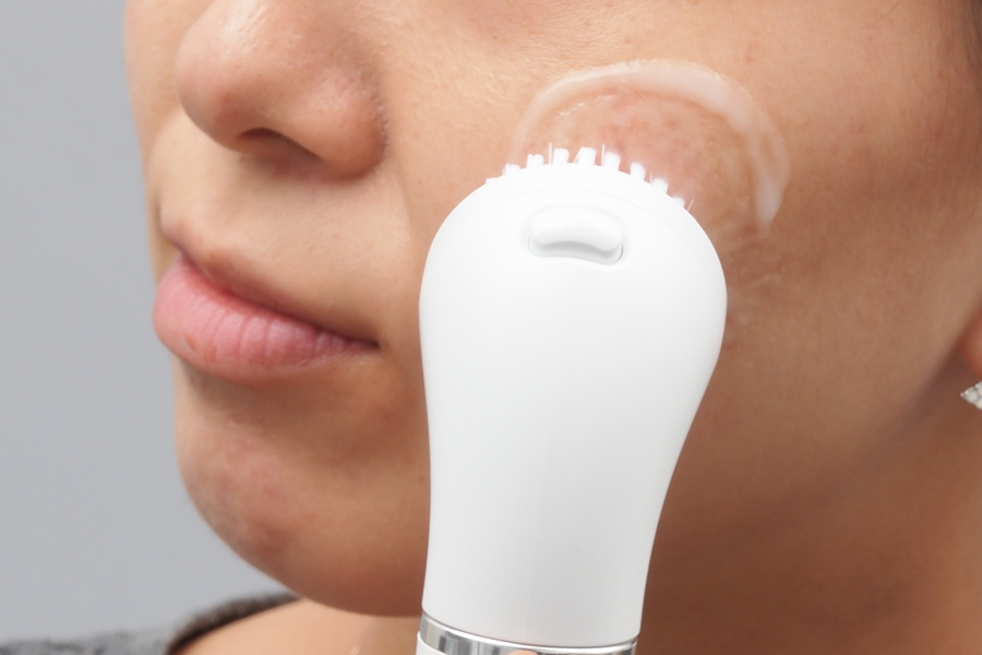 脱毛ヘッドをクレンジングブラシに付け替えて使ってみます。クレンジングブラシは、回転と微振動によって角質を除去。“手洗いの6倍の洗浄力”で肌を整える効果が期待できるそうです。脱毛ヘッド同様左右両方向に回転させることができ、せっけん、洗顔クリーム、クレンジングミルク、クレンジングジェルとあわせて使用可能。製品に付属している基本のブラシのほか、敏感肌用ブラシ、角質ケア用ブラシ、ファンデーションなどをムラなく仕上げるメイクアップスポンジが別売されているので、肌質や用途に合わせて使い分けることができます。