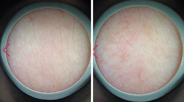 脱毛前(左)と脱毛後(右)のほおの肌。途中で切れてしまった毛もあるようですが、かなりの割合できれいに抜けているように見えます