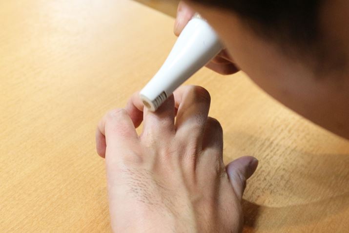SE830が細い産毛を脱毛できることはわかりました。反対に、太めの毛ではどうでしょう? 太めの毛も処理できるようであれば“ワキ毛が1、2本ちょろり”というピンチにも対応できそうです。男性のムダ毛で検証してみることに。