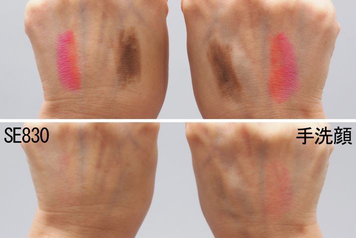 ブラシの洗浄力をチェックしましょう。手の甲にウォータープルーフのアイブロウペンシルと口紅で汚れを付け、クレンジングミルクを塗布した上からブラシと手で3往復ずつなぞりました。