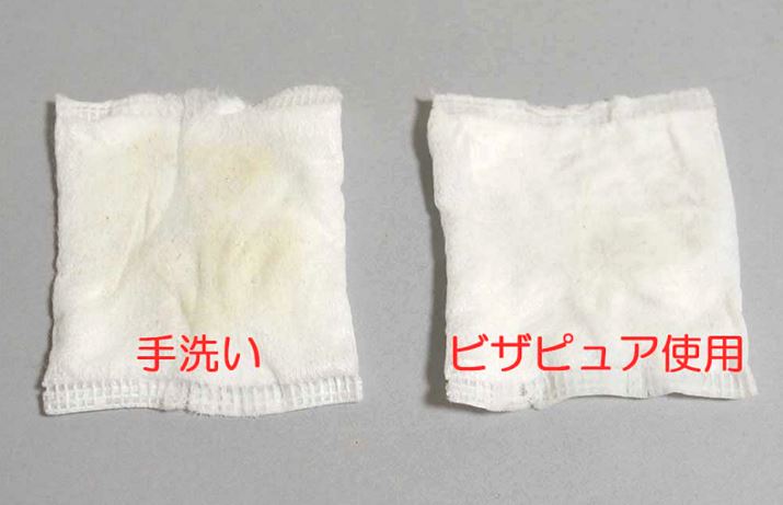 両腕にファンデーションを厚塗りし、左は手洗い、右はビザピュアでクレンジング。その後、ふき取り化粧水でゴシゴシふくと手洗いのコットンには汚れがゴッソリ!