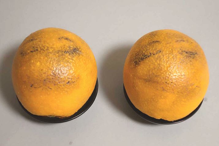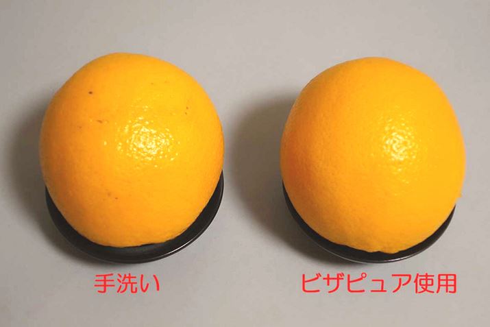 最後に、片方は手洗い、残りはビザピュアで洗顔。ビザピュアで洗顔したほうに比べ手洗いのオレンジは、凹凸の部分に洗い残しがみられます