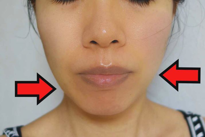 向かって右側の顔だけタッピングをしたところ。頬の高い部分がタッピングしたほうが上に上がっているのがわかる。また、右側のみ血行がよく、肌の色も健康的