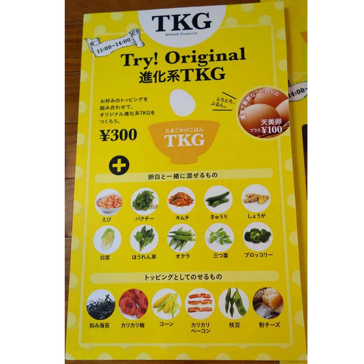 ただし、注意が必要なのがイベントの時間。オリジナルのTKGを作れるのは、イベント開催中の11:00〜14:00のみ。14:00〜22:00は、ブラウンの公式レシピ「オクラの進化形TKG」と「ほうれん草の進化形TKG」、そしてWIRED CAFEとのコラボメニュー「タコライス風進化形TKG」の販売のみになります。また、最終日は14:00までの販売なので気を付けてくださいね。
