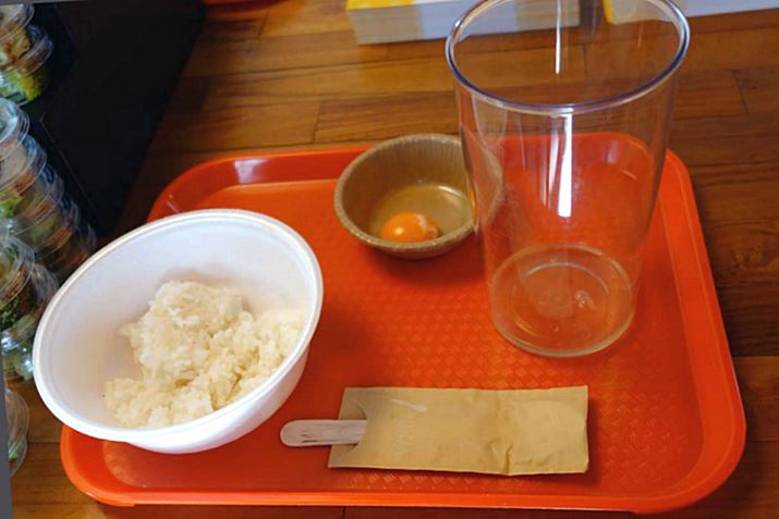 店に入ると、まずはプレーンなご飯に、卵の黄身、透明なカップに入った白身が渡されます。ちなみに、この基本セットで300円。なんと300円でトッピングも選び放題! また、ちょっと贅沢したい人は100円をプラスすることで、鳥取のプレミアム卵「天美卵」にランクアップすることも。この卵、一般的な卵に比べてコレステロールが低く、グルタミンが多いのだとか。グルタミンは腸の免疫機能を高めるらしいのですが、40℃以上の熱で壊れてしまうので、TKGが最適な食べ方なのだそう。ただし、天美卵は一日限定50個まで。