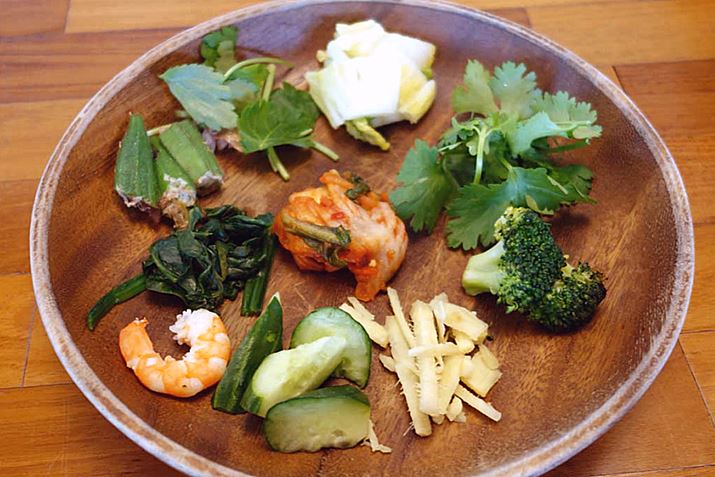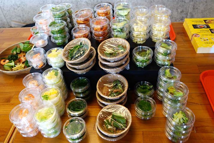 基本セットを受け取ったら、卵に混ぜる野菜などを選択します。トッピングは白菜やほうれん草、えび、キムチ、ブロッコリーなど10種類ありました。小さなパックに小分けされています