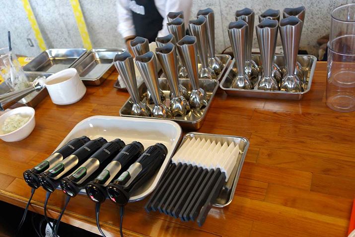 基本セットとトッピングを手に、白身をフワフワに撹拌するコーナーへ!たくさんのマルチクイックが用意されており、自分で撹拌体験ができます