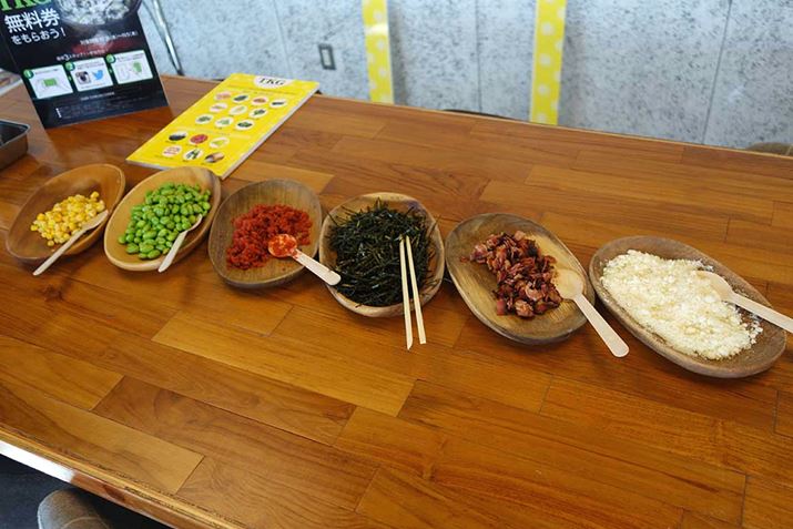 トッピングにはコーン、枝豆、カリカリ梅、刻みのり、カリカリベーコン、粉チーズを用意。食感を重視したトッピングが多いですね。枝豆をのせつつ、「これじゃ緑ばかりだから黄色いコーンものせようか?」と盛り上がります