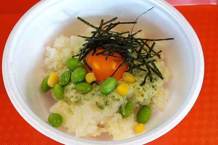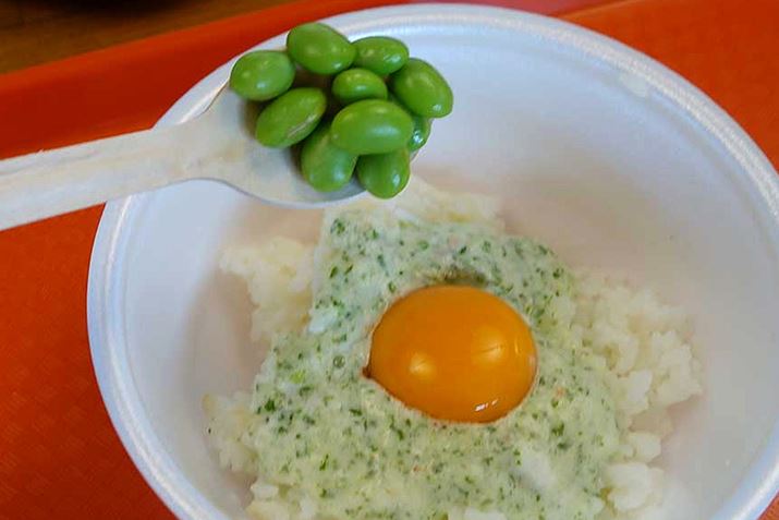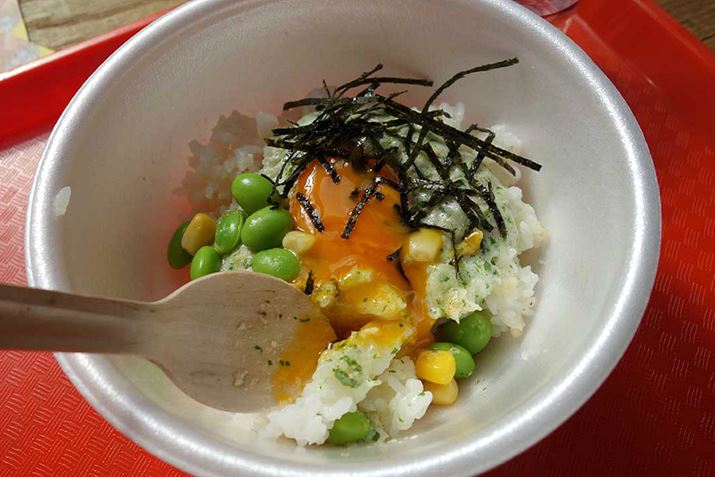 いざ実食してみると……これを「卵かけご飯」と呼んでよいのでしょうか。最初はフワフワとした口当たりのメレンゲが、口の中でシュワッととける食感に驚きますが、その後、卵の濃厚な黄身と野菜とエビの香りと旨みが、一気に口の中に広がります。さらに、最後にのせた枝豆とコーンがプチプチとはじけて、色々な食感を味わうことができます。調理時間は2分ほどにもかかわらず、時間をかけて作った一品のような味。とても400円のTKGとは思えません。