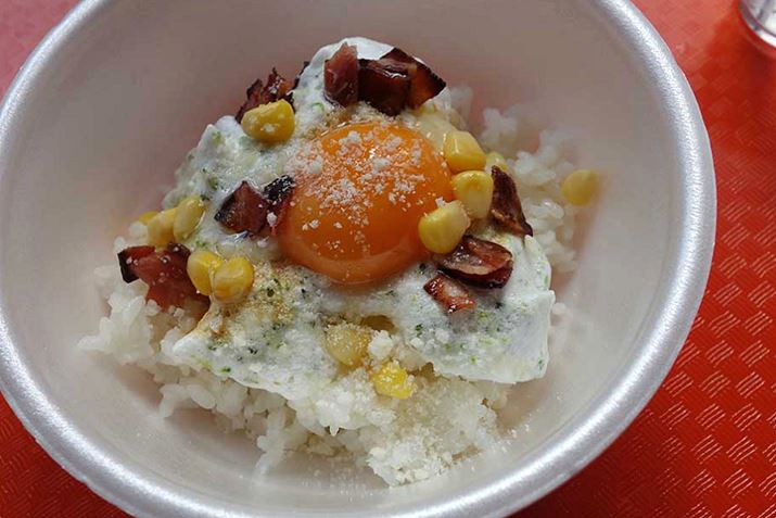 「これが3杯目」という隣の人のTKG。こちらは白身にブロッコリーを混ぜ、トッピングにカリカリベーコンとコーン、調味料にはオリーブオイルと塩コショウを使用した「洋風TKG」。美味しそう