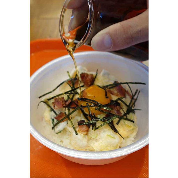 あとは、TKGにかける調味料を選択してかければ完成。アジア風の具を選択していた筆者は、スタッフ全員一致のおススメでナンプラーを選択!