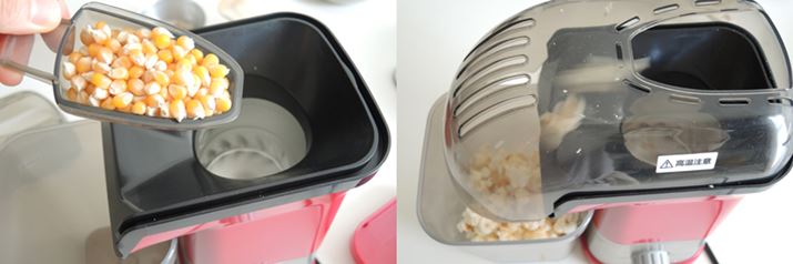 (1) まずはポップコーンの準備です。ポップコーンメーカーに乾燥ポップコーンを入れます。