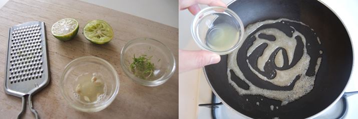 (3) すだちハニー味の材料を用意しましょう。すだちの皮はすりおろし、汁をしぼっておきます(小さじ1程度)。