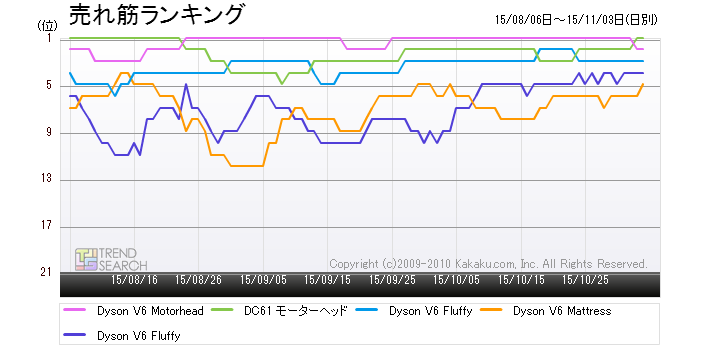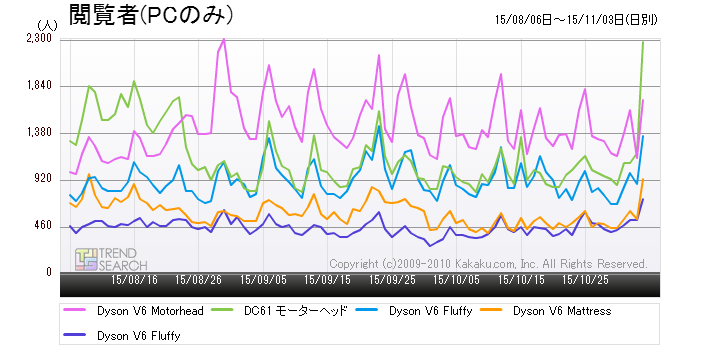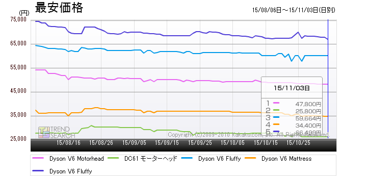 なお、これらダイソンの人気製品5モデルの最安価格は図5の通り。最も安いのは旧モデルの「ダイソン DC61 モーターヘッド」で、25,800円という最安価格をつけているが、新モデルの「Dyson V6」に関しては、ベーシックモデルの「Dyson V6 Motorhead」が47,800円、上位モデルの「Dyson V6 Fluffy」が59.664円、さらに上の「Dyson V6 Fluffy+」が66,499円と(最安価格はいずれも2015年11月3日時点)約5〜7万円程度の価格帯に位置しており、決して安い製品ではない。にも関わらず、ダイソンの「Dyson V6」各モデルは、今好調なセールスとなっている。
