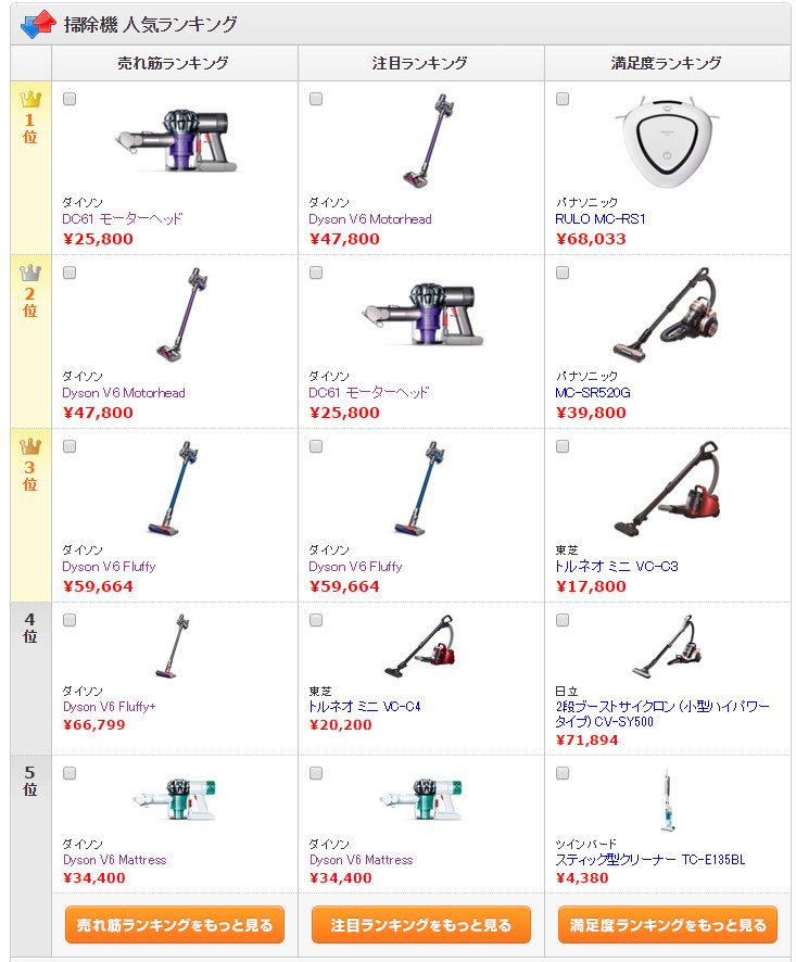 図1:価格.comの「掃除機」カテゴリーにおける売れ筋ランキング(2015年11月4日現在)