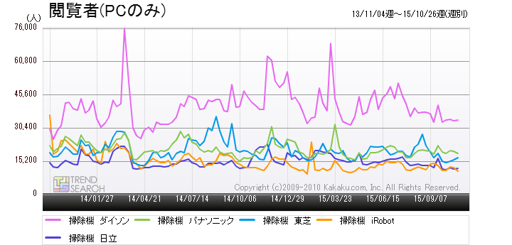 図2は、「価格.comトレンドサーチ」で、価格.comの「掃除機」カテゴリーにおける主要5メーカーの製品PVアクセス数の推移を示したものだ。これを見ればわかるように、人気の高さで首位を走るダイソンは、ここ2年間ほど他の掃除機メーカー各社を寄せ付けない強さを見せつけている。逆に、ダイソンを除く4社(パナソニック、東芝、日立、iRobot)は、ほぼ同率で熾烈な2位争いを演じている。