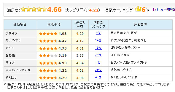 なお、動作音については、「キーンという金属音が。なれれば大丈夫です」といったように、決して静かではないようだが、その点は多くのユーザーがパワーとのトレードオフとして納得している様子。そのほか、手入れのしやすさに関して、「ゴミ捨て時にダストカップの下を開けるのですが、ホコリが舞う。そしてダストカップに溜まったゴミがきれいに落ちてこないので、手で出す必要があるときがある」のように、この点が本機唯一のウィークポイントだと評する声もあった。