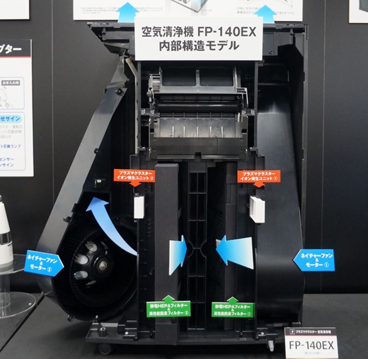空気を浄化するもっとも重要な手法は、ろ過。本体に空気を吸い込んでフィルターで汚れを取り除き、キレイになった空気を部屋に放出するというものだ。そのため、大きな空間をカバーするには大きな風量が必要となる。ここで問題となるのが運転音。ファンの回転数を上げれば風量は増幅できるが、同時に運転音も大きくなってしまう。この課題を解決するため「FP-140EX」には、ファンとモーターを2基ずつ搭載。“回転数を抑えながらも大風量=運転音の低減”ができるようになり、最大風量14m³/分でも運転音は55dB(強運転時)に抑えられたという。