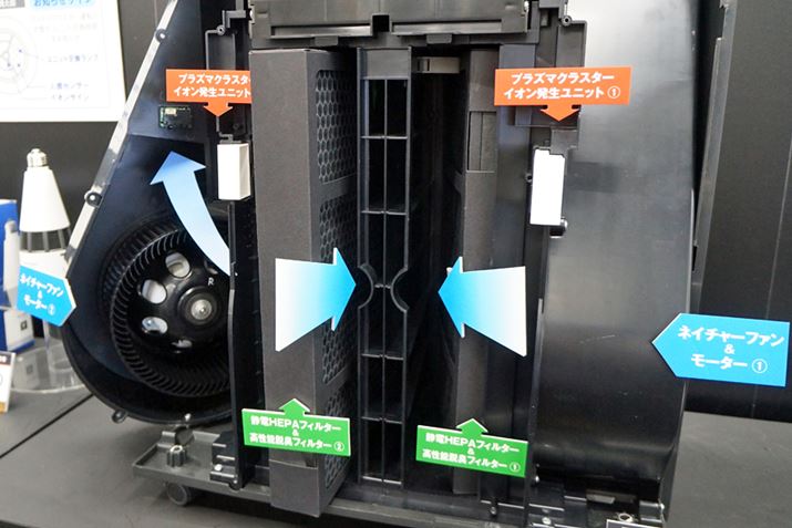 左右に1つずつフィルター、ファン、モーター、プラズマクラスターイオン発生ユニットを搭載。本体背面から吸い込まれた空気がフィルターを通り、ファンによって部屋に拡散される