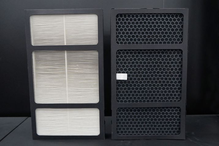 2つのフィルターは、奥に向けて少し外側に向かうようにセットされる。ファンを2基装備する構造には、フィルターを斜めに設置するほうが送風効率がよくなるのだそう